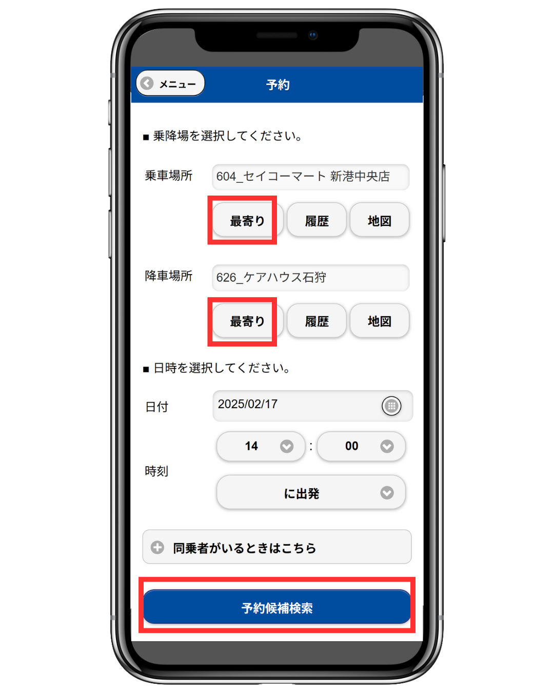 - 乗車場所と目的地が同じ場合に限り、最大3人の予約が可能です。