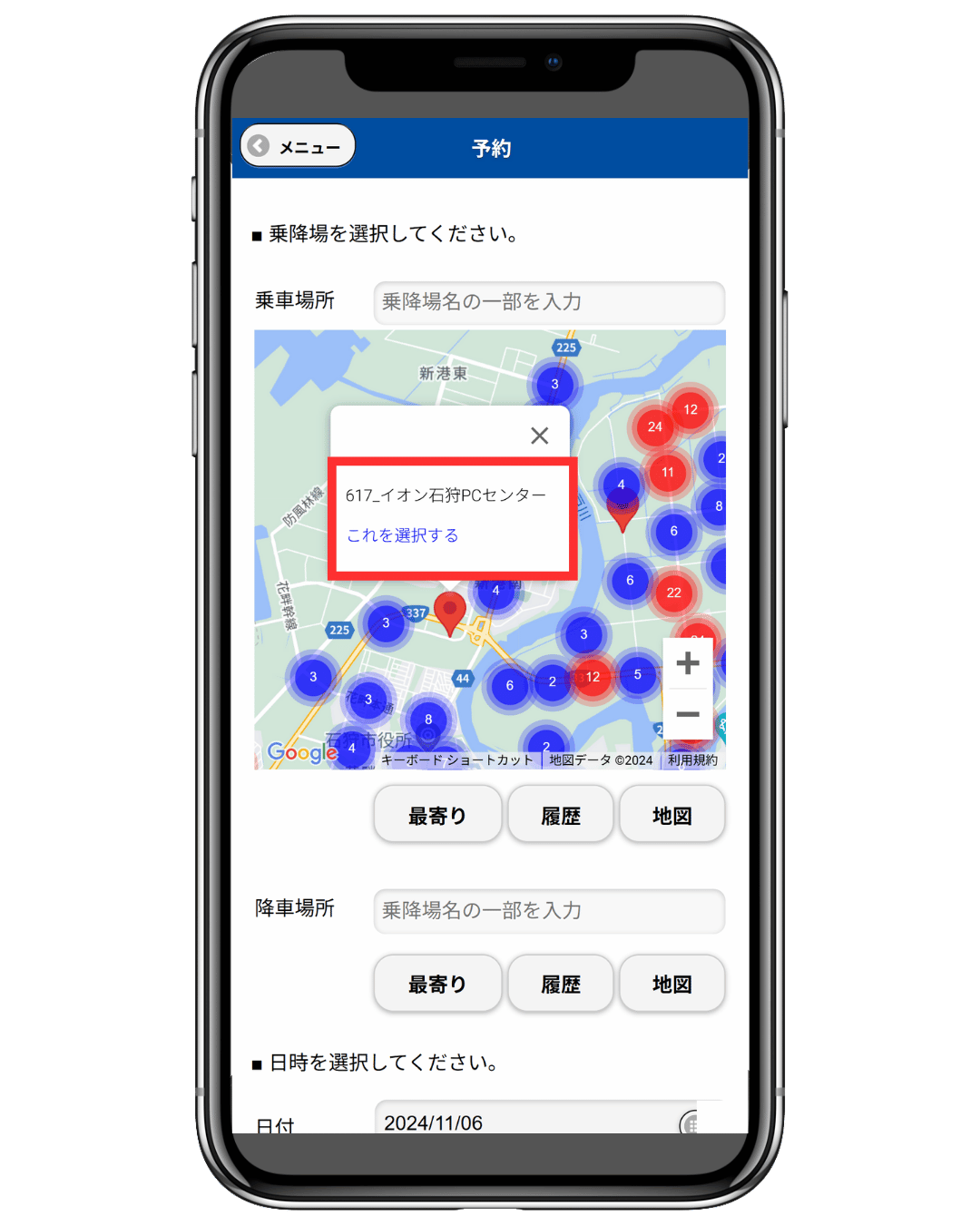 指定はできますか? - 事前に決められた乗降地点の中から、お客様が希望する出発地・目的地によって乗降場所が自動的に指定されます。