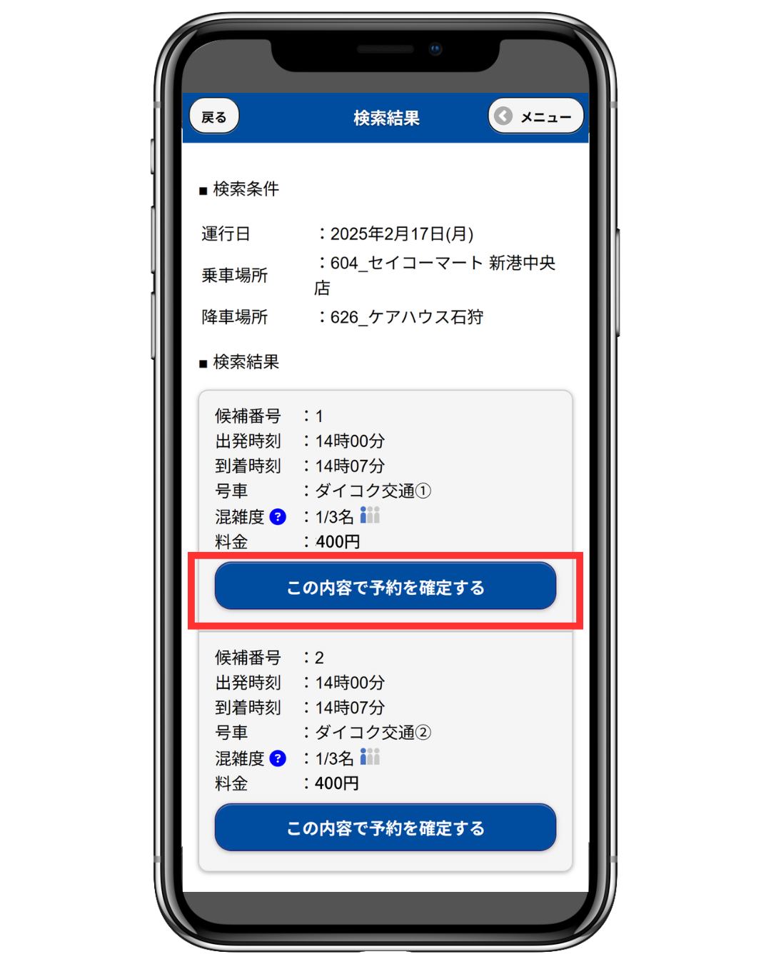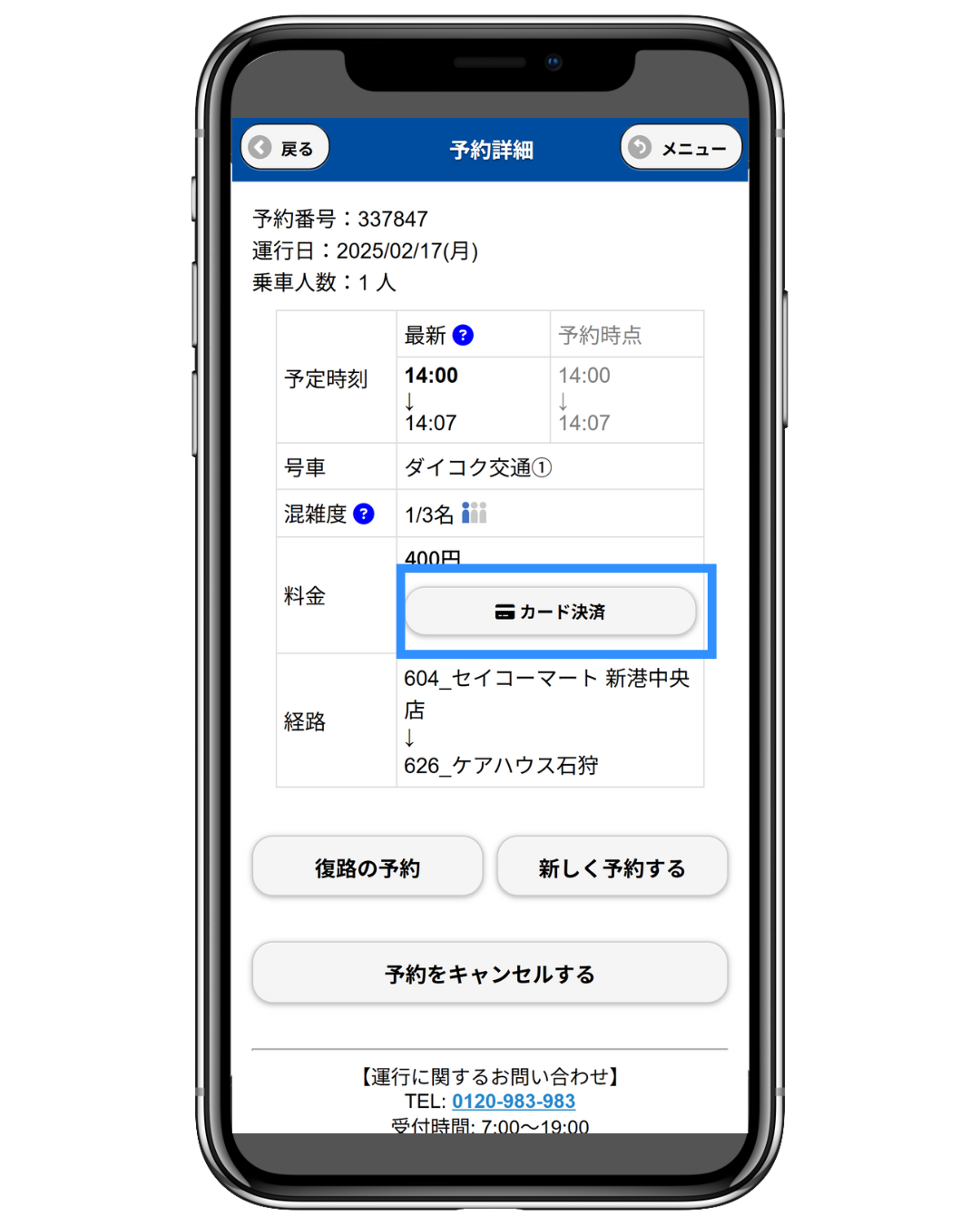 乗車場所が異なる場合は、それぞれ予約をする必要がございます。 - 目の前にデマンドカーがいるのですが