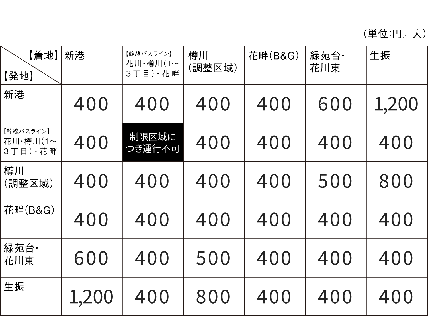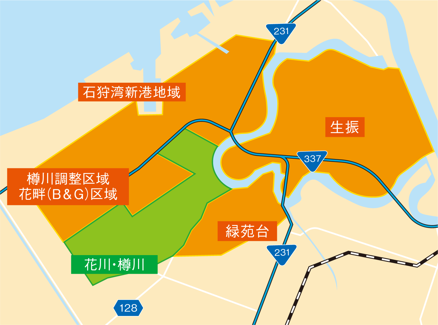 - 運行エリアを「生振」「緑苑台」「花川樽川地域」「樽川(調整区域)」「花畔(B&G)」「石狩湾新港地域」としております。上記6エリア内を移動可能ですが、出発地点・到着地点のどちらかは、必ず「生振」、「緑苑台」、「樽川(調整区域)」、「花畔(B&G)」、「石狩新港地域」のいずれかとなります。